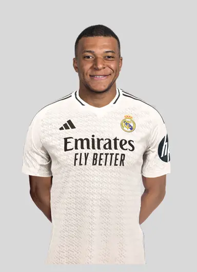 Comprend le numéro et le nom officiel de Mbappé au dos, ainsi que les patchs de la Ligue des Champions avec le nombre de coupes remportées sur la manche droite ou celui de LaLiga comprenant le logo de LaLiga et celui de champions.
